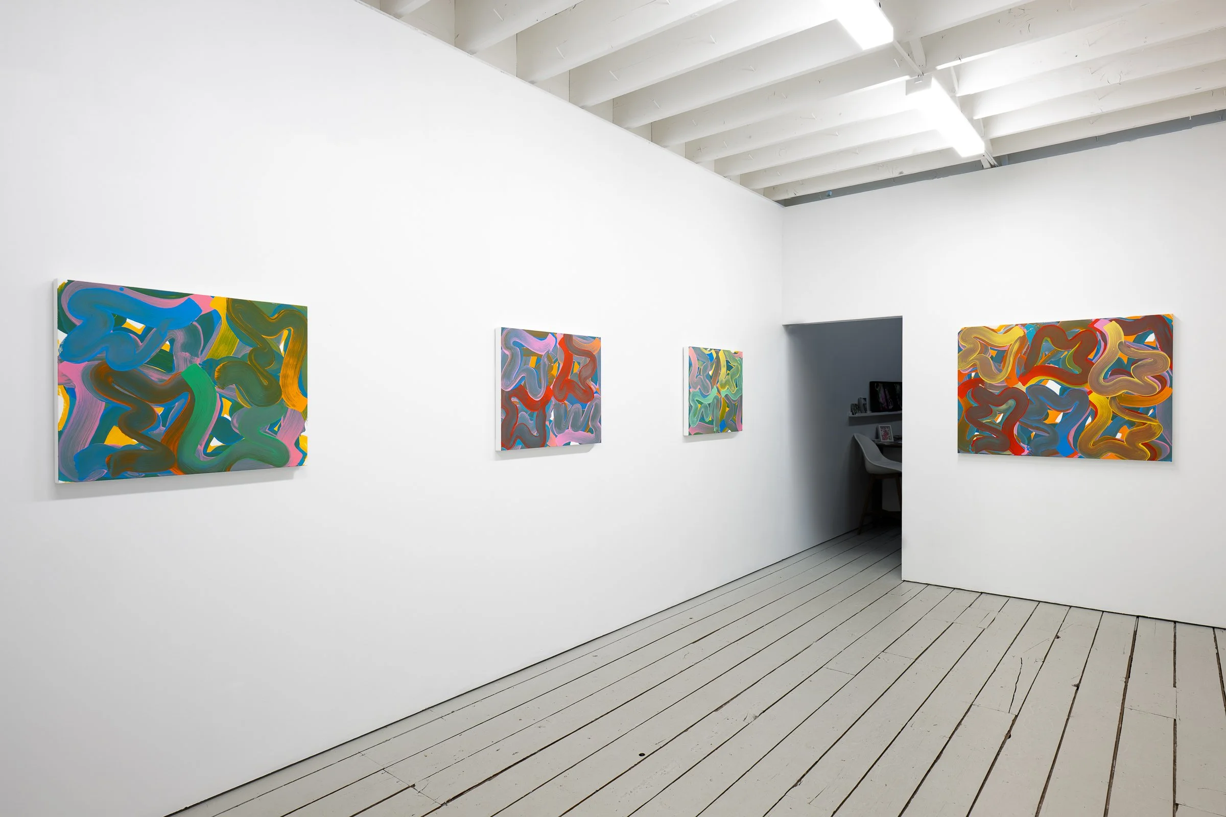 Exhibition text/press release: Phillips’ gestural paintings immerse viewers in an experience where colour, material, and movement converge. Working with canvases laid flat rather than on the easel, he engages in a horizontal practice that heightens the physicality of paint itself—its weight, viscosity, and unpredictability. Through repetition and swirling layers, each work records the artist’s gestures while simultaneously prompting a vicarious bodily response from the viewer. More than a formal exploration, Whirl also challenges ingrained assumptions in the history of painting. Phillips interrogates gendered biases that link gesture to masculinity and colour to femininity, proposing instead a non-binary understanding where both are inextricably entwined. His work becomes a conduit for shared sensory experience, expanding the language of contemporary abstraction and opening up new ways of seeing and feeling. Born in Spalding, Canada in 1964, Leon Phillips is a contemporary painter currently based in Vancouver. His work has been exhibited in solo presentations at the Yukon Arts Centre (Whitehorse, Canada) and the Amelia Douglas Gallery (New Westminster, Canada), and is held in collections including the Canadian Consulate General (Chicago, IL, USA) and the Daugavpils Mark Rothko Art Centre (Daugavpils, Latvia). He has participated in programs and residencies at the Banff Centre for Arts and Creativity (Canada) and the International Painting Symposium at the Daugavpils Mark Rothko Art Centre. Phillips’ practice pushes the boundaries of colour and form, embedding painting with structural and conceptual force.
